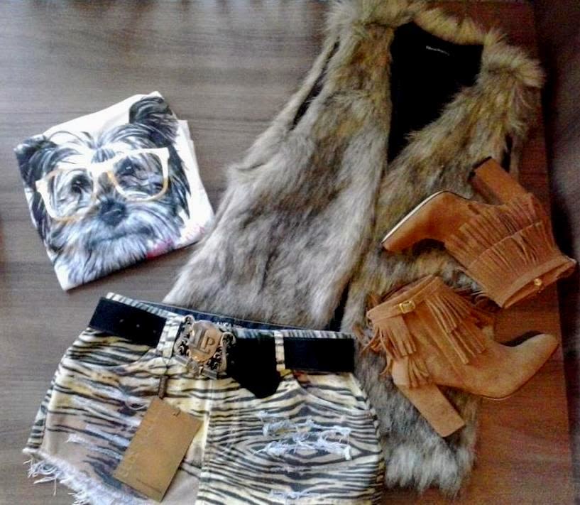 O colete de pelo já foi um queridinho do inverno passado, mas foi uma tendência que não pegou muito, este inverno ele apareceu novamente e desta vez para ficar. Combinamos ele com um T-shirt fofa e um short-saia que já vem com cinto. A bota cano curto com franjas finalizou o look.