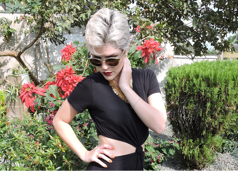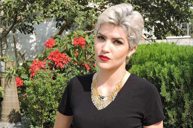 Esse look permitiu que eu optasse por acessórios chamativos e uma maquiagem impactante (