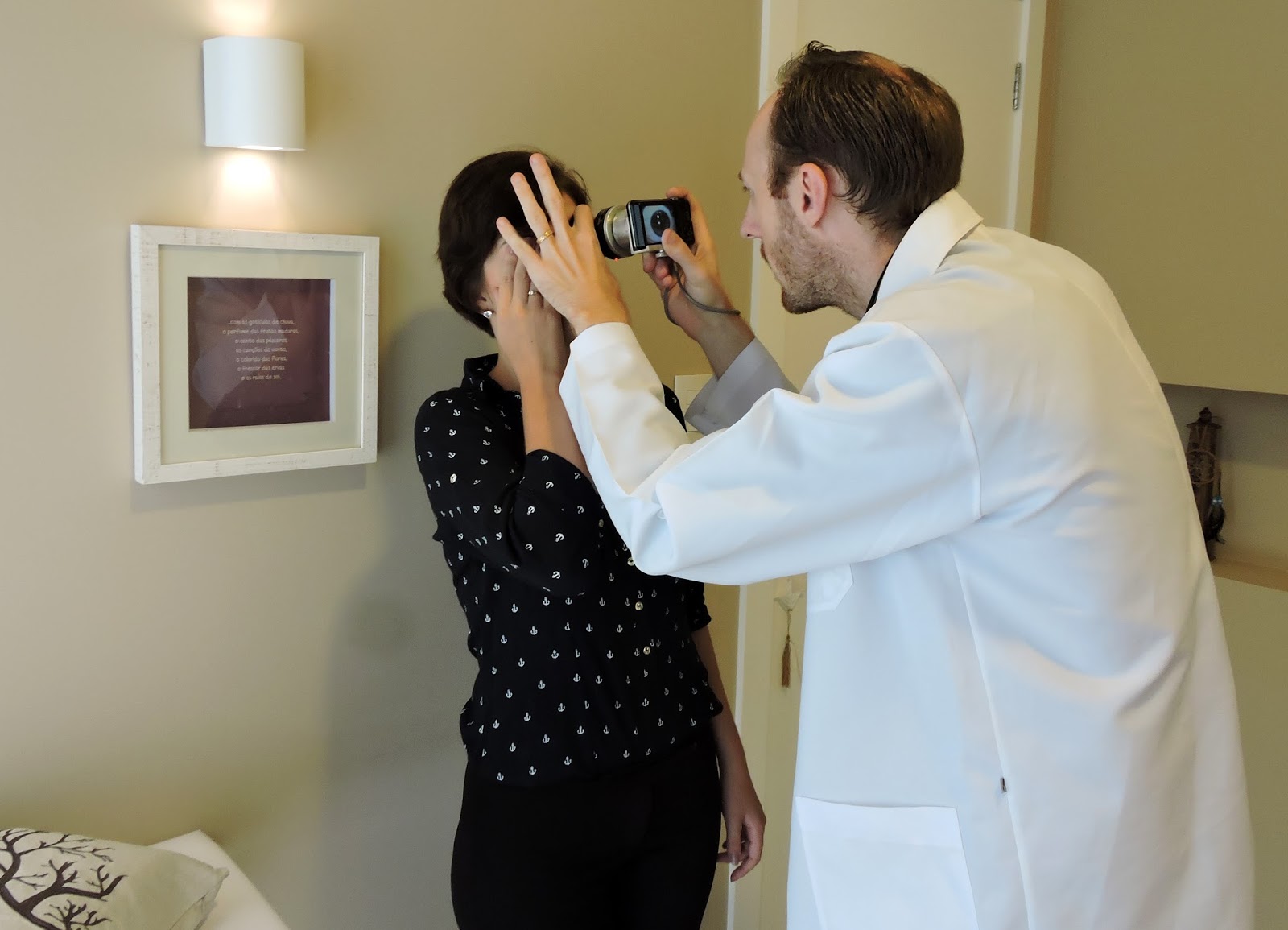 Terapeuta Iridolo Milton Fredrich retirando a foto da íris esquerda.