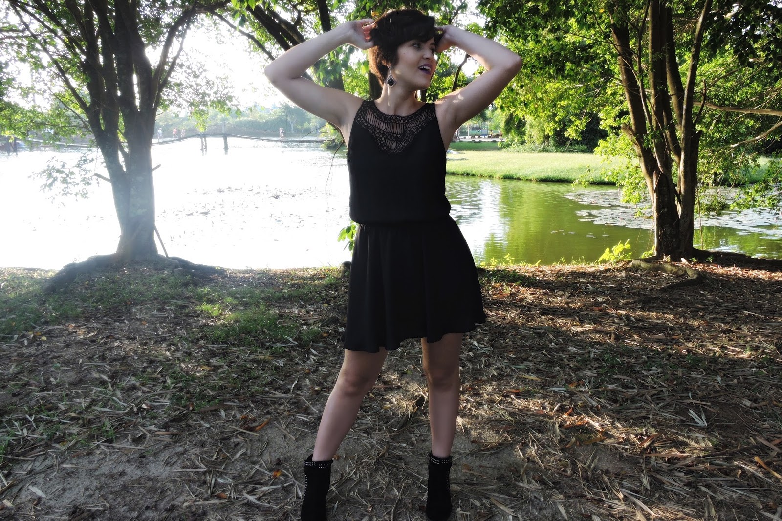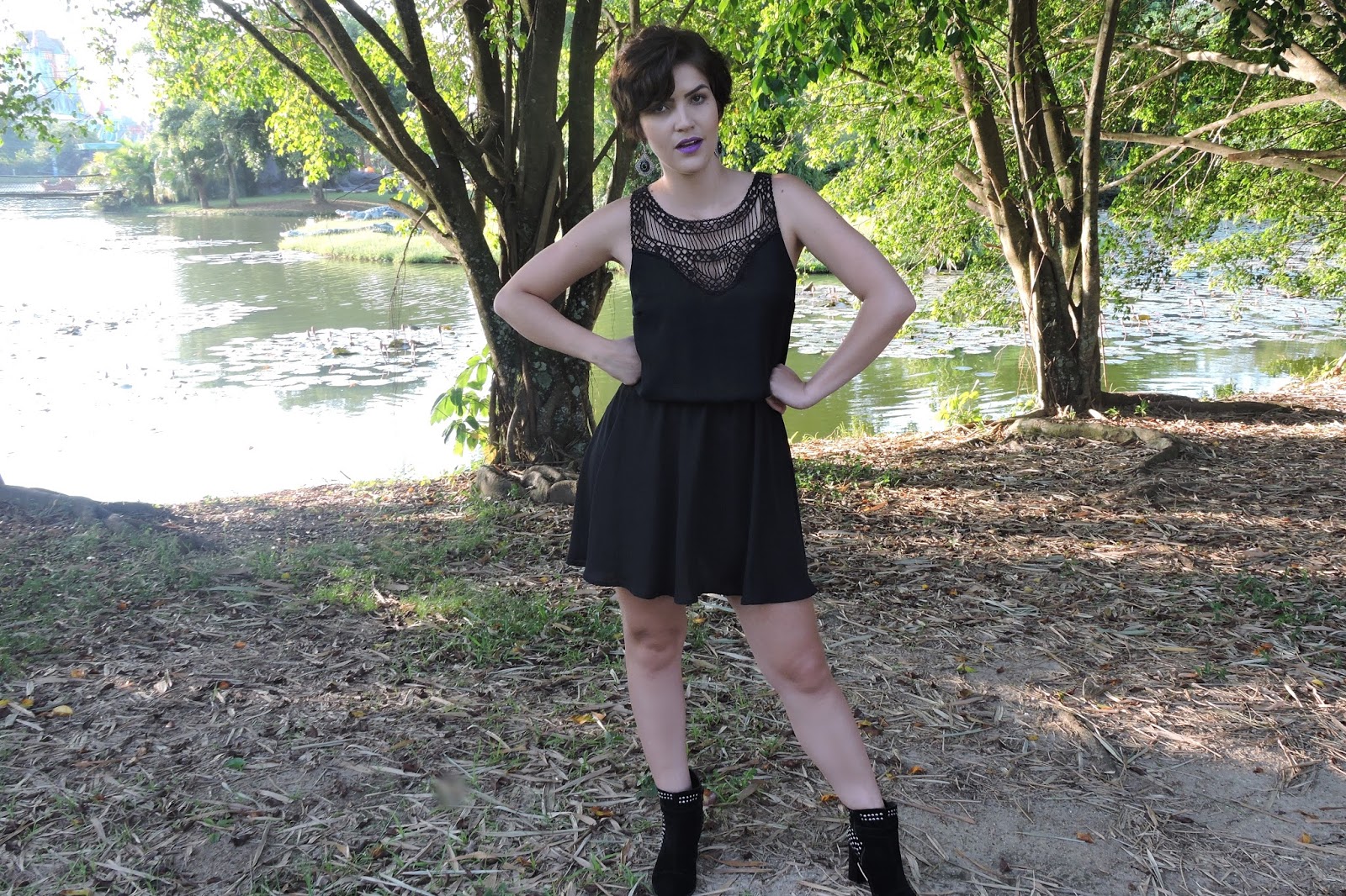 Eu adoro composições simples, sem muitas cores e informação, gosto de coisas objetivas e ainda assim estilosas. Esse look é o exemplo disso, o vestido preto larguinho com detalhes discretos no colo, permitiu que eu ousasse um pouco mais na hora de escolher o calçado.