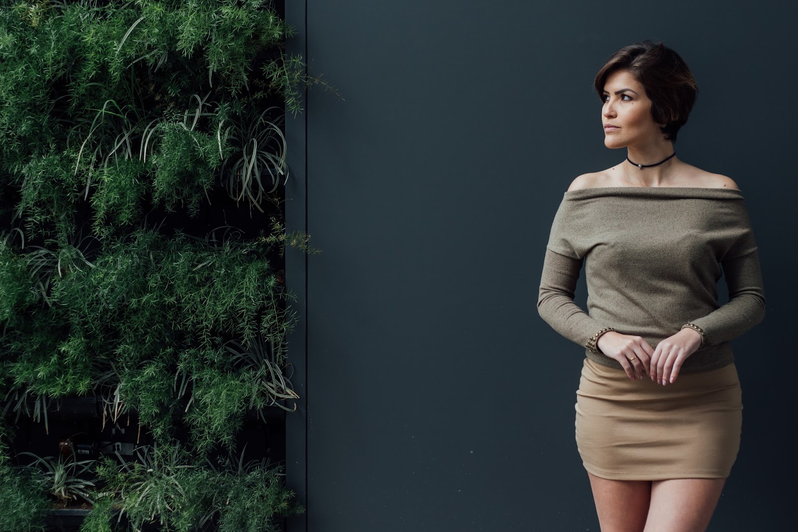 Vocês já sabem que eu adoro uma roupa curta hehe, então como a blusa é comportadinha apostar em uma saia curta é uma ótima escolha. Também feita sob medida essa saia nude com cintura mais alta modela bem o quadril e por conta da sua cor ser neutra ela se torna curinga, podendo ser usada em com várias outras produções.