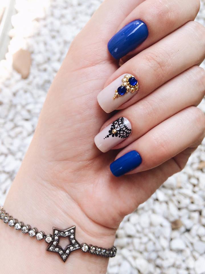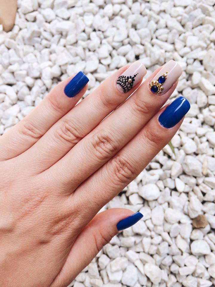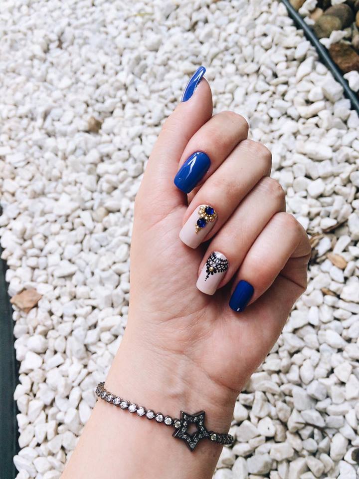 Já a delicadeza foi combinar o esmalte "Patins" da Impala com aplicações de pedrarias em tons de azul e dourado e uma meiga decoração feita manualmente com pincéis pela Re. O resultado final ficou apaixonante *-*