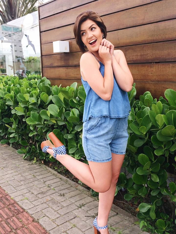 Nesta produção apostei nem uma sandália salto bloco jeans com poa branco, um calçado super estiloso que ornou com o macaquinho, mas também poderia usá-lo com tênis branco, sapatilha de cor clara ou então uma rasteirinha, pois a peça permite diversas produções.