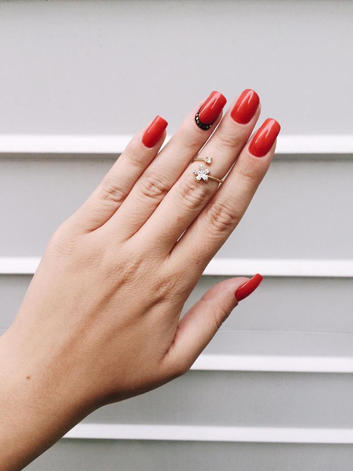 A decoração desta semana foi bem básica perto do que apronto por aqui hehe, optei pela tendência da meia lua invertida nas unhas dos dedos anelares, escolhi elas em preto para dar um contraste bonito aplicando pedrarias douradas.