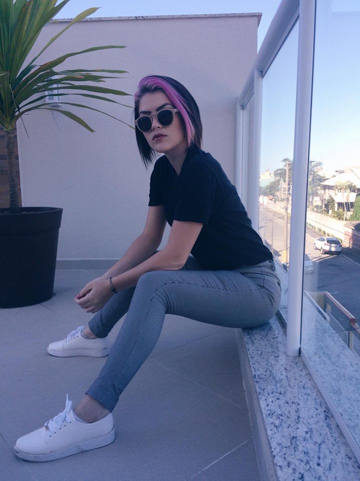 ano. Para completar, um óculos redondo e nos pés o tradicional tênis branco .