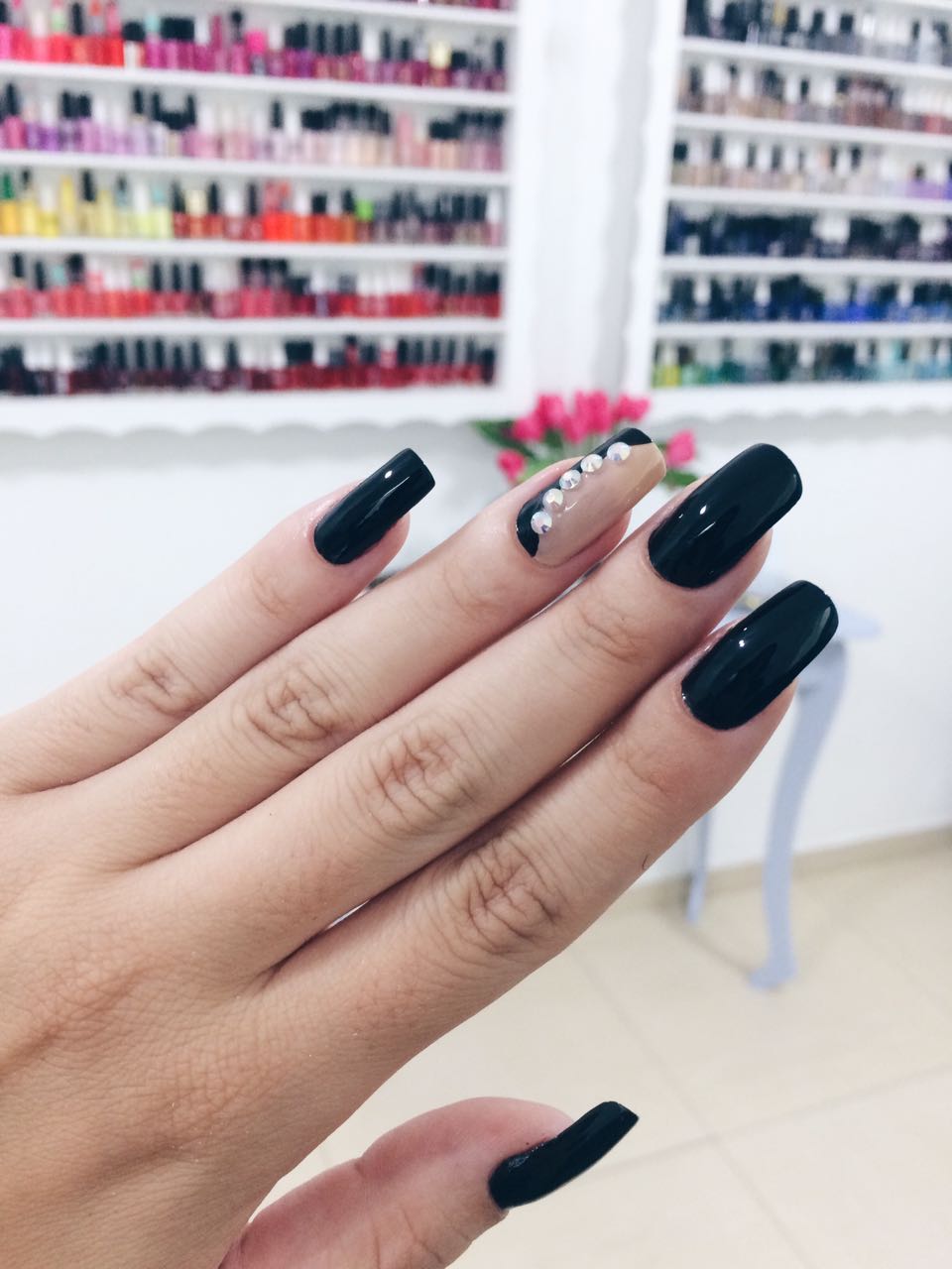 Desta vez apostei no clássico black e nude, duplinha que eu adoro e combina com tudo! O esmalte destaque foi o "Nimbus" da Big Universo e os detalhes ficaram nas unhas dos dedos anelares, onde foi aplicado o esmalte "Cool Nude" da PS fazendo um trabalho no estilo 'meia lua' e no encontro das duas cores forem aplicadas pedrarias furta-cor e o resultado foi esse trabalho lindo...