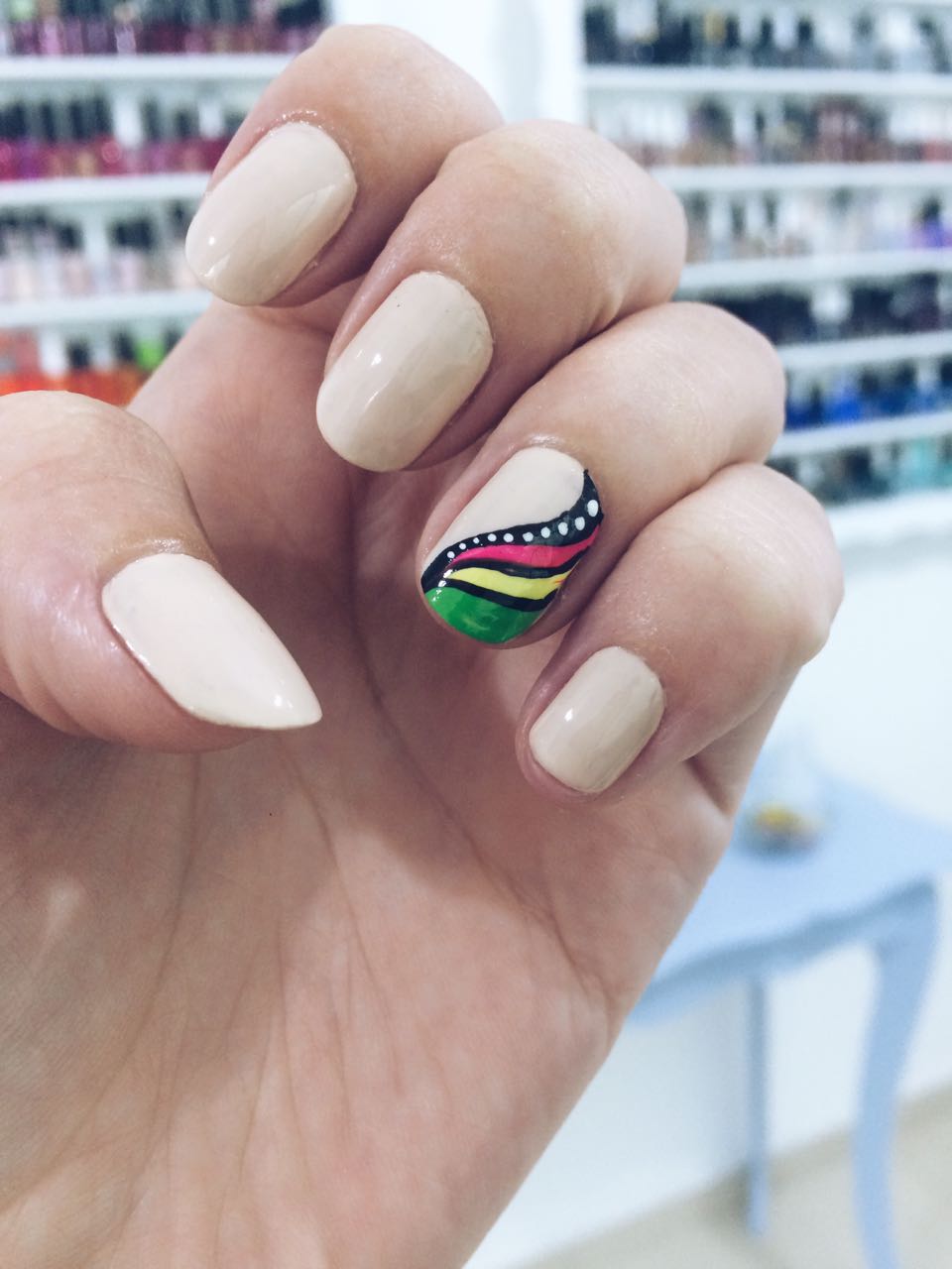 Me inspirei na alegria do carnaval para as unhas dessa semana feitas no Espaço Renata Unhas Decoradas. Como minhas unhas estão curtinhas, apostei no esmalte 'Chic' da Marina Ruy Barbosa e para completar, o destaque ficou para o mix de cores feito com tintas rosa, amarelo, verde, preto e branco nas unhas dos dedos anelares.
